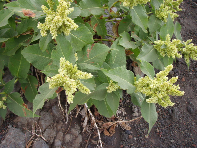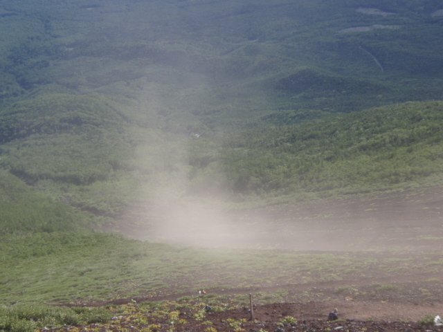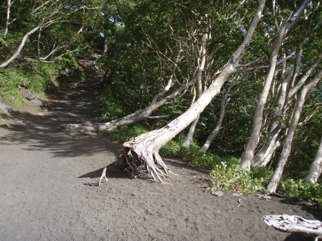 このように溶岩質の山肌です。このような火山灰の上に生育する植物は、すぐ乾く栄養分のない地面と強風に耐えられる種類のものがふもとから少しずつ取りついたもので、根を深く広く張って少ない水分を吸収しています。すごい生命力ですね。