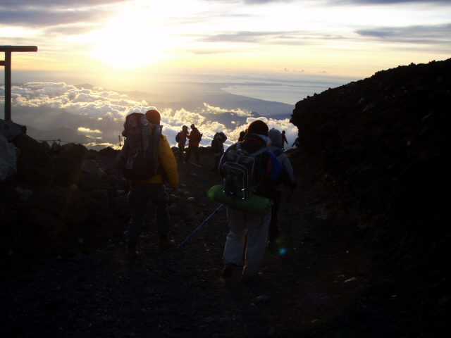 御殿場ルート→最も長くハードなルートで山小屋も少ないかわりに静かな登山が出来ます。下りは「大砂走り」と呼ばれる砂礫の斜面をスイスイ降りて来れます。歩行距離19.5km、登り7時間30分、下り3時間。